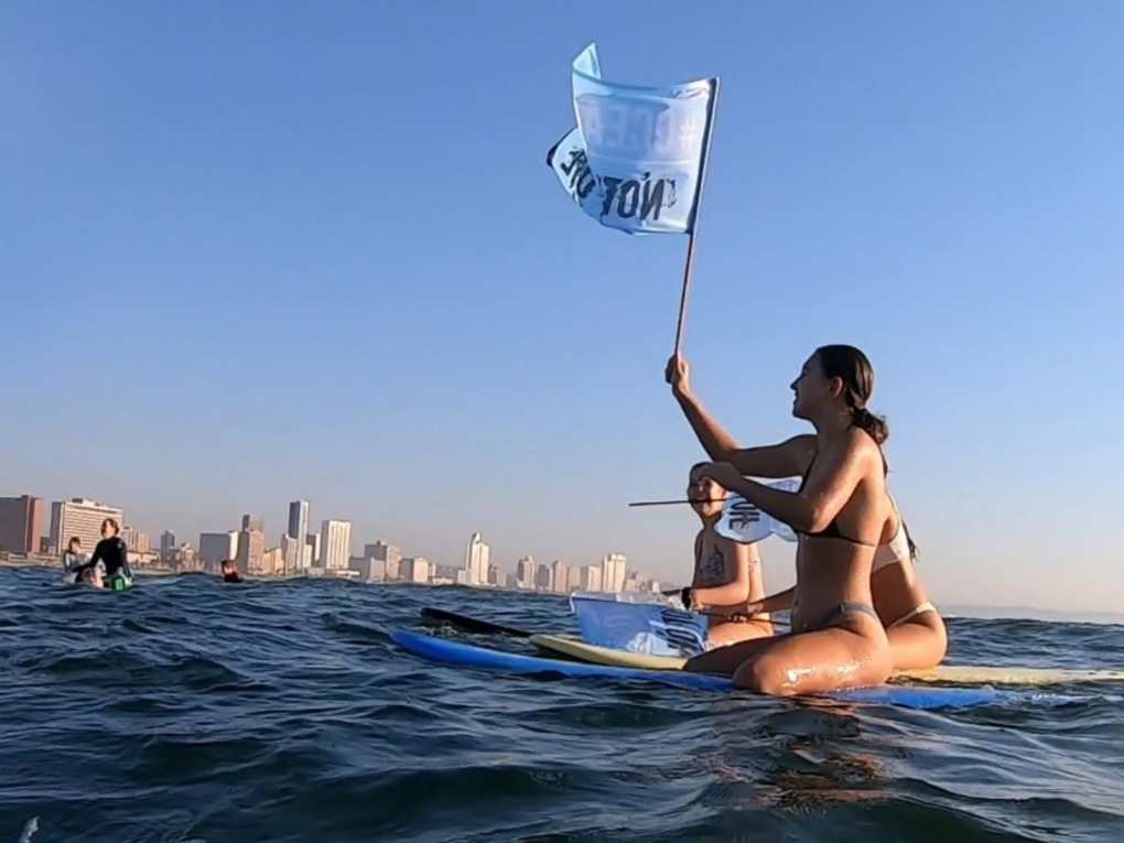 Ocean lovers along the South African coast came out in beautiful formation to support the “Save South Africa’s Coast & Future: Stop the offshore oil & gas exploration application ER236” petition, demanding that Minister of Environment, Forestry and Fisheries, Barbara Creecy withdraw her approval of the application. Of deep concern is the consequence to the coastline and marine life if ENI and Sasol drill 2 wells offshore Scottburgh and 4 wells off Richards Bay in the fast Agulhas current. These pioneer wells will become the deepest globally, will contribute to global warming and sea level rise, and threaten our future.