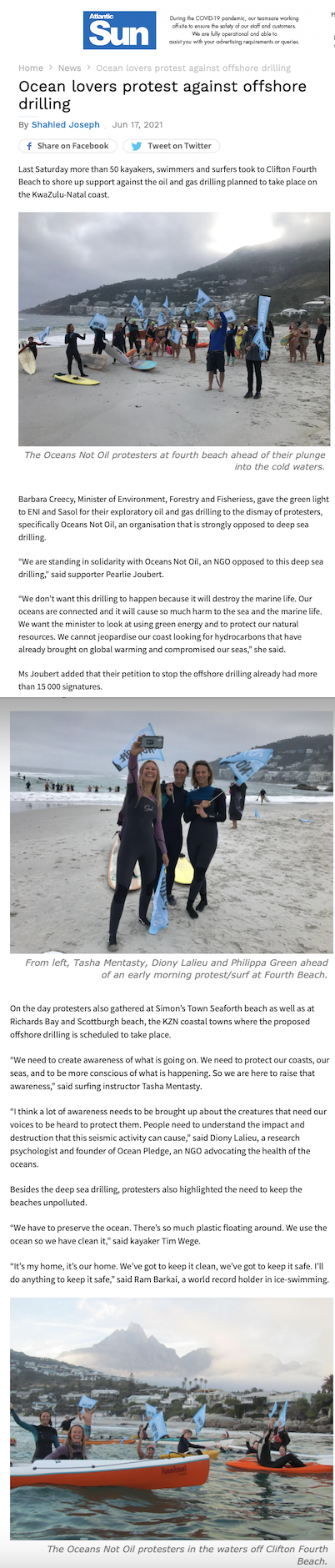 In support of the hundreds willing to brave colder seas, the thousands of signatures of concerned citizens have been added to the petition demanding the minister for the environment, Barbara Creecy, who heads up the the offshore oil and gas stream of economic development program, Operation Phakisa, withdraw her approval of ENI & Sasol’s application to drill.