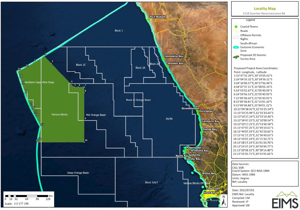 Searcher proposes to undertake a 3D seismic survey off the West Coast of South Africa. The proposed project area is located between approximately 256 km offshore of St Helena Bay, extending north along the western coastline to approximately 220 km offshore of Hondeklip Bay. The survey area at the closest point is approximately 218 km offshore of the coast of the Western and Northern Cape.