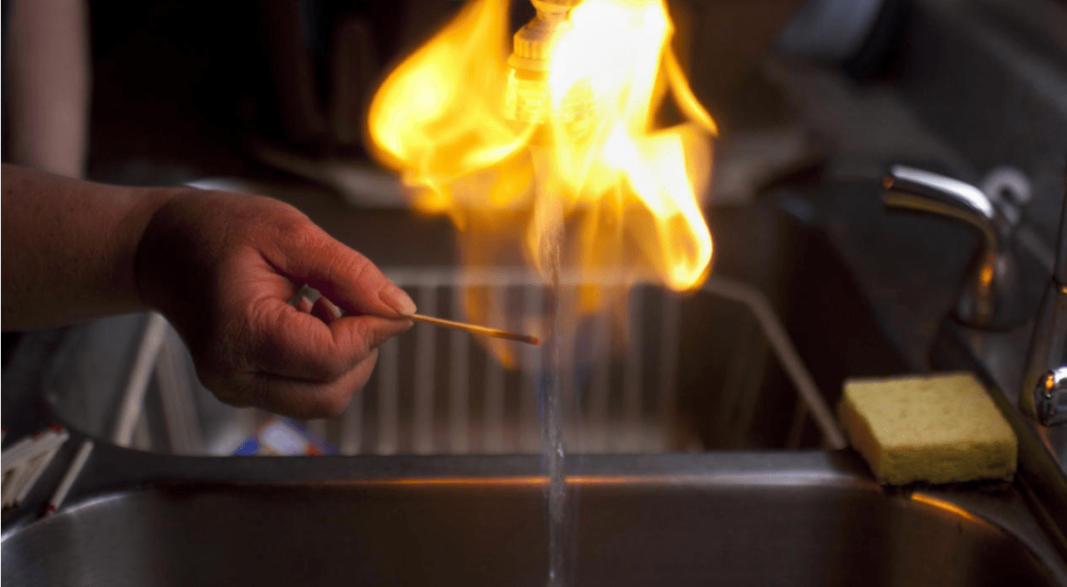 Picture Caption: A Pennsylvanian resident is able to ignite the water coming out of her kitchen faucet because of methane that has seeped into her well. Many homes in rural areas rely on private wells for drinking water. Picture cred: Les Stone / Greenpeace