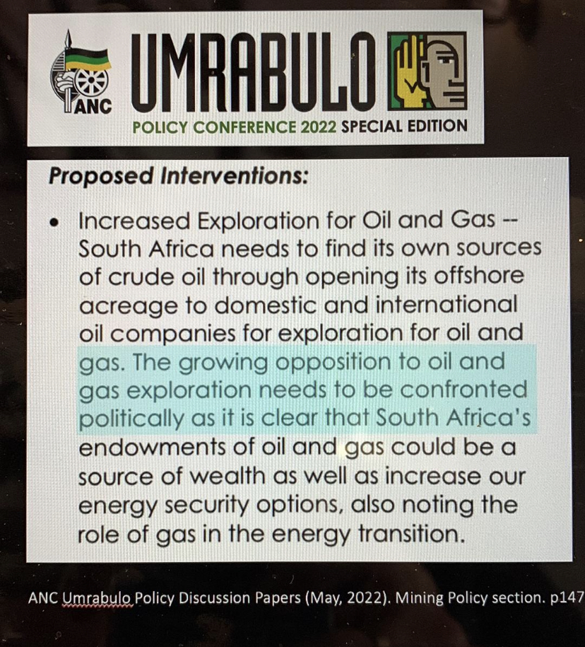 Resistance to oil majors on our coast and the Operation-Phakisa-imaginary has provoked a rejoinder from the ruling party, African National Congress, whose Policy Discussion Papers of May, 2022 proposed the stratagem of “opposing politically” those who oppose oil and gas. This brings to mind Michael Watt’s warning that the continental shelf becomes” the forcing house for the development of deepwater and ultradeepwater oil and gas production”[5].