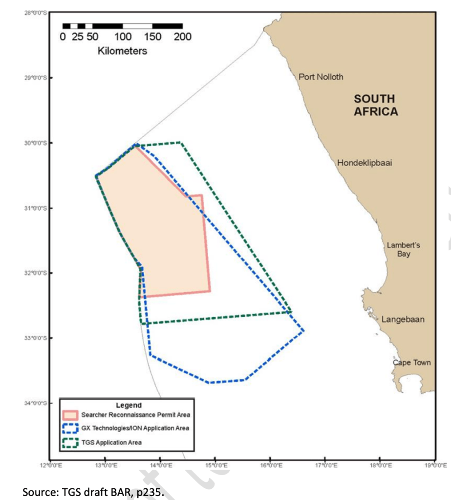To date there are now 4 overlapping pending applications for the same area of ocean with Petroleum Agency South Africa: Searcher Geodata; GX Technology Corporation; TGS 3D seismic survey area, as well as this new one planned . That these applications may become operational back to back between 2023 to 2024, or simultaneously, speaks of the cowboy antics and a complete disregard of the Critical Biodiversity and Ecological Support areas that abut these survey/exploration localities and the inhabitants reliant upon them.