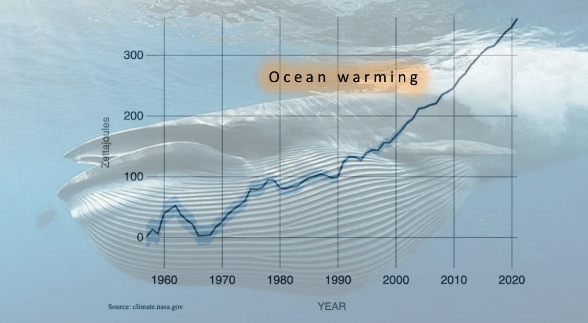 Meanwhile 90% of global warming is occurring in the ocean (NASA). The global average sea level rise from 2022 to 2023 was nearly four times the increase of the previous year. As we write the most extensive coral bleaching event on record is happening to more than half the planet’s coral (54% and counting 1% every week).