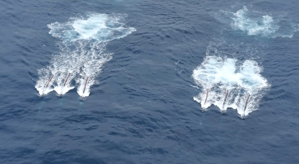Towed behind the airguns is a configuration of cables with mounted hydrophones and geophones, called steamers. The streamers are towed at a depth of between 6-30m and not visible on the surface, with the exception of the tail-buoys on the far-end of the streamers which can be seen on the surface. A configuration of steamers can be up to 12 km in length behind a vessel.
