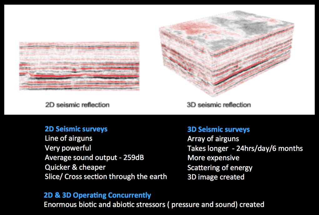 - Since sound travels more easily under water than through the air, the blasts from a single seismic survey can travel tens of thousands of square kilometres. Scientists have proven that this noise interrupts the communication, reproduction, navigation and eating habits essential to the survival of marine life, including whales, dolphins, turtles, fish, shellfish and even tiny plankton. These waves of energy also damage eggs, larvae and incite fish and other mobile marine species to migrate away from the affected area. Seismic airgun reconnaissance poses an unacceptable risk of serious harm to marine life at the species and population levels, the full extent of which is often not understood until long after the harm occurs.