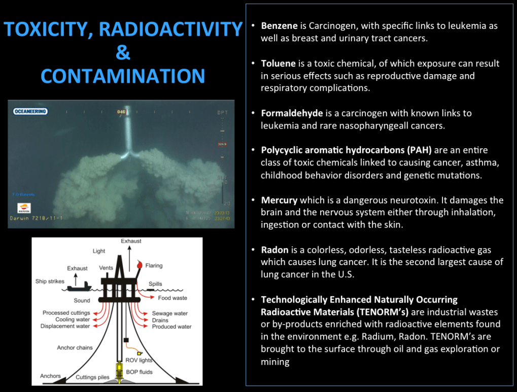 - The process of drilling releases thousands of gallons of “operational waste”, known as drill muds and cuttings, which are discharged overboard. These muds contain toxic substances like benzene, zinc, arsenic, radioactive materials, heavy metals and other contaminants used to lubricate drill bits and maintain pressure. Pending the level of toxicity, these muds are legally allowed to be released back into the marine environment, impacting the seafloor, benthic community, water column biology.